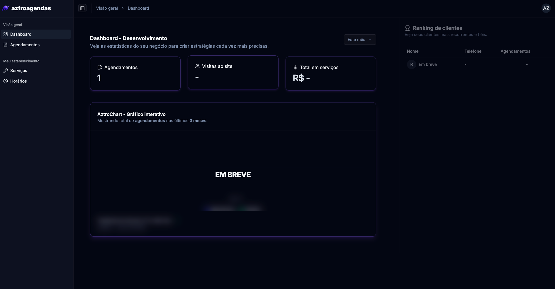Dashboard completo com visão geral dos agendamentos, receitas, clientes mais ativos e métricas essenciais para tomada de decisão estratégica.